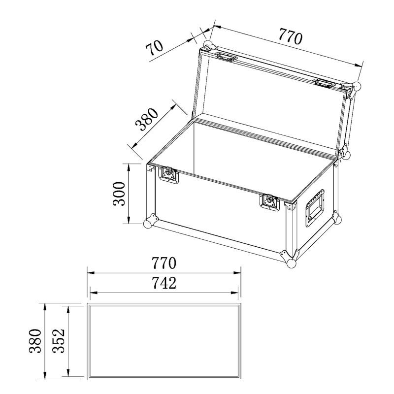 2 Handles2 Butterfly latches4 FeetDimensions: 770 x 380 x 370 mmWeight: 13 kg