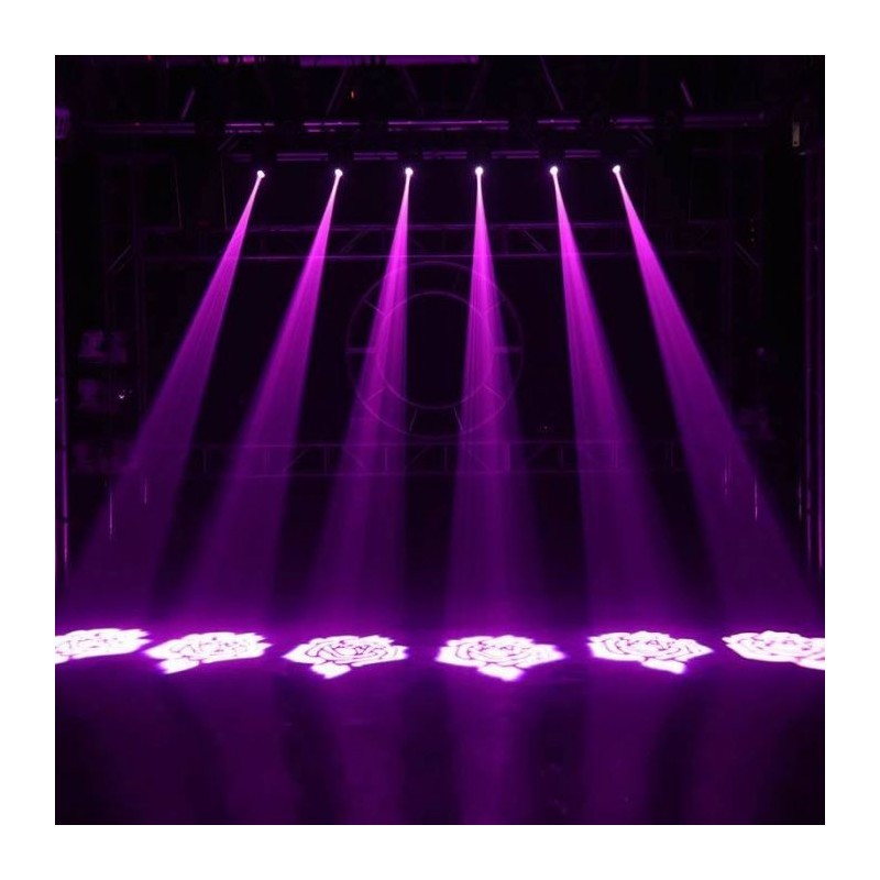 Avec sept couleurs et sept gobos, cette tête mobile offre un spectaculaire show de lumières, via la gestion audio, un des 8 programmes intégrés ou via un contrôleur DMX.